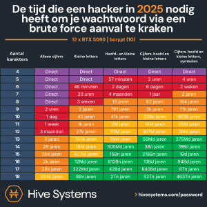 Om die verschillen inzichtelijk te maken, zijn er tabellen ontwikkeld, zoals die van Hive Systems, die laten zien hoeveel tijd het in theorie zou kunnen kosten om wachtwoorden van verschillende lengtes en tekensets te achterhalen. Niet als exacte voorspelling, maar als manier om duidelijk te maken hoe groot het verschil kan zijn tussen korte en langere wachtwoorden.