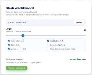 Om mensen te helpen bewustere keuzes te maken bij het aanmaken van nieuwe wachtwoorden, hebben we sterkwachtwoord.nl ontwikkeld. De tool genereert sterke, willekeurige wachtwoorden en geeft daarbij een duidelijke indicatie van de geschatte sterkte op basis van de denkwijze uit de Hive Systems-tabellen.